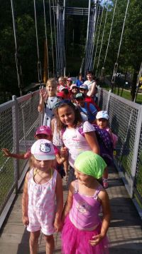 Nasze dzieci ze świetlicy oraz przedszkola w Wałbrzychu uczestniczyły we wspólnym wyjeździe nad Jezioro Lubachowskie mieszczące się w Zagórzu Śląskim - malowniczo położonej wsi w dolinie Bystrzycy, pomiędzy Górami Sowimi i Górami Czarnymi. Początkiem wielkiej przygody było przejście mostem linowym przez wielką wodę, choć nogi uginały się ze strachu to nikomu - nawet najmłodszym - nie zabrakło odwagi. Rejs statkiem, piaszczysta plaża, dużo słońca doskonale wpasował się w klimat wakacyjnego wypoczynku. Przygodę zakończyliśmy swobodną zabawą w "małpim gaju".