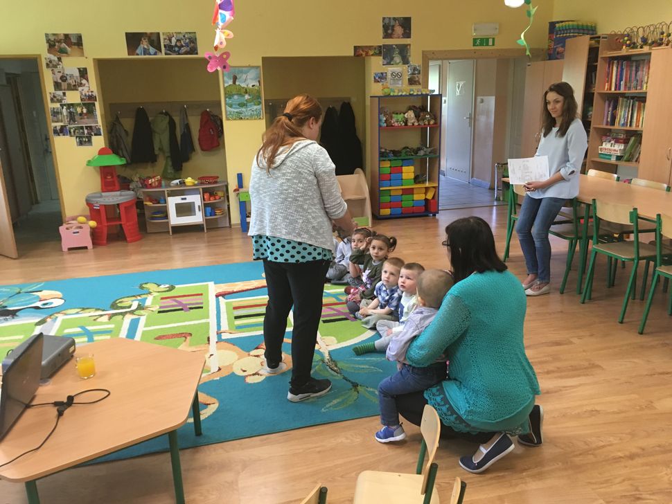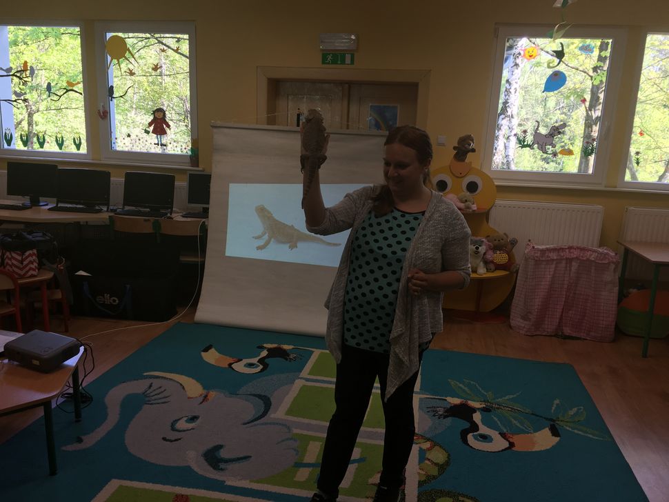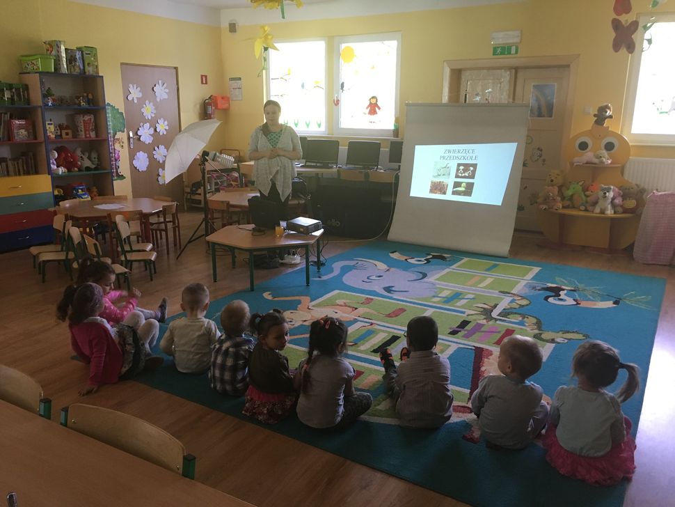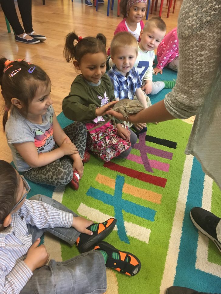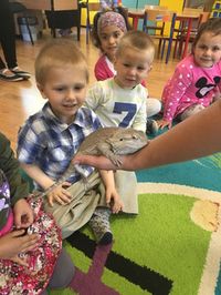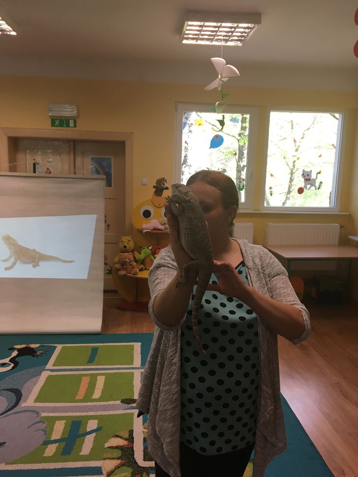 W dniu 17.05 wałbrzyskie przedszkole odwiedził niecodzienny gość: Migotka. Takie imię nosi zwierzątko przywiezione przez panią, która opowiadała o jego zwyczajach, sposobie spędzania czasu, odżywiania się. Nie jest to zwierze do przytulania ani głaskania ale pani pozwoliła każdemu dziecku przywitać się z Agamą Brodatą głaszcząc po grzbiecie. Na zakończenie prezentacji każdy mógł zrobić sobie zdjęcie z Migotką trzymając ją ....na ramieniu.