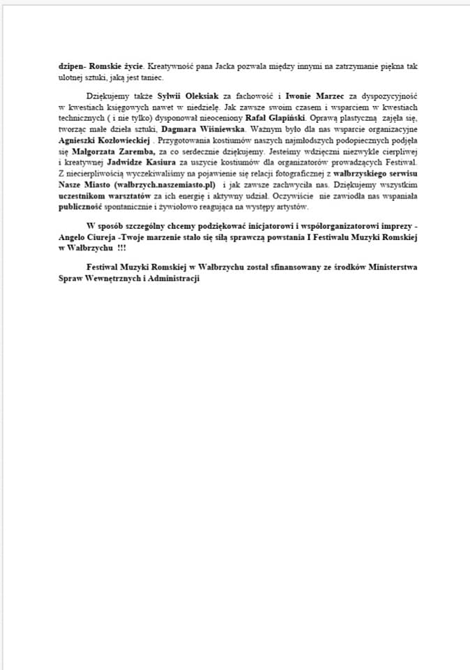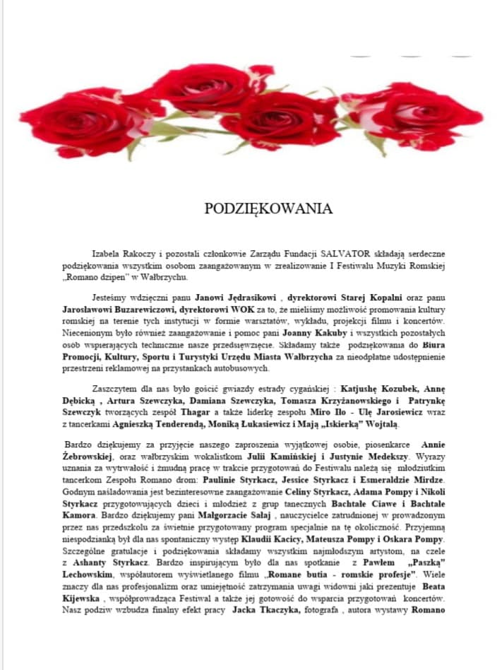 Składamy serdeczne podziękowania Angelowi Ciureja wraz z zespołem `Romano Drom`, Panu Andrzejowi Ciureja, Pani Fatimie Szczerba, Pani Dorocie Frączek, Paulinie Styrkacz, Jessice Styrkacz, Vanesce Pompie, Marii Ciureja „Kruszyny” oraz wszystkim innym osobom zaangażowanym w organizację, przygotowanie i realizację Charytatywnego Koncertu Muzyki Romskiej `Romano Dzipen`, który odbył się w sobotę 11 maja 2019r. w przepięknym wnętrzu Teatru Zdrojowego w Szczawnie Zdroju.
