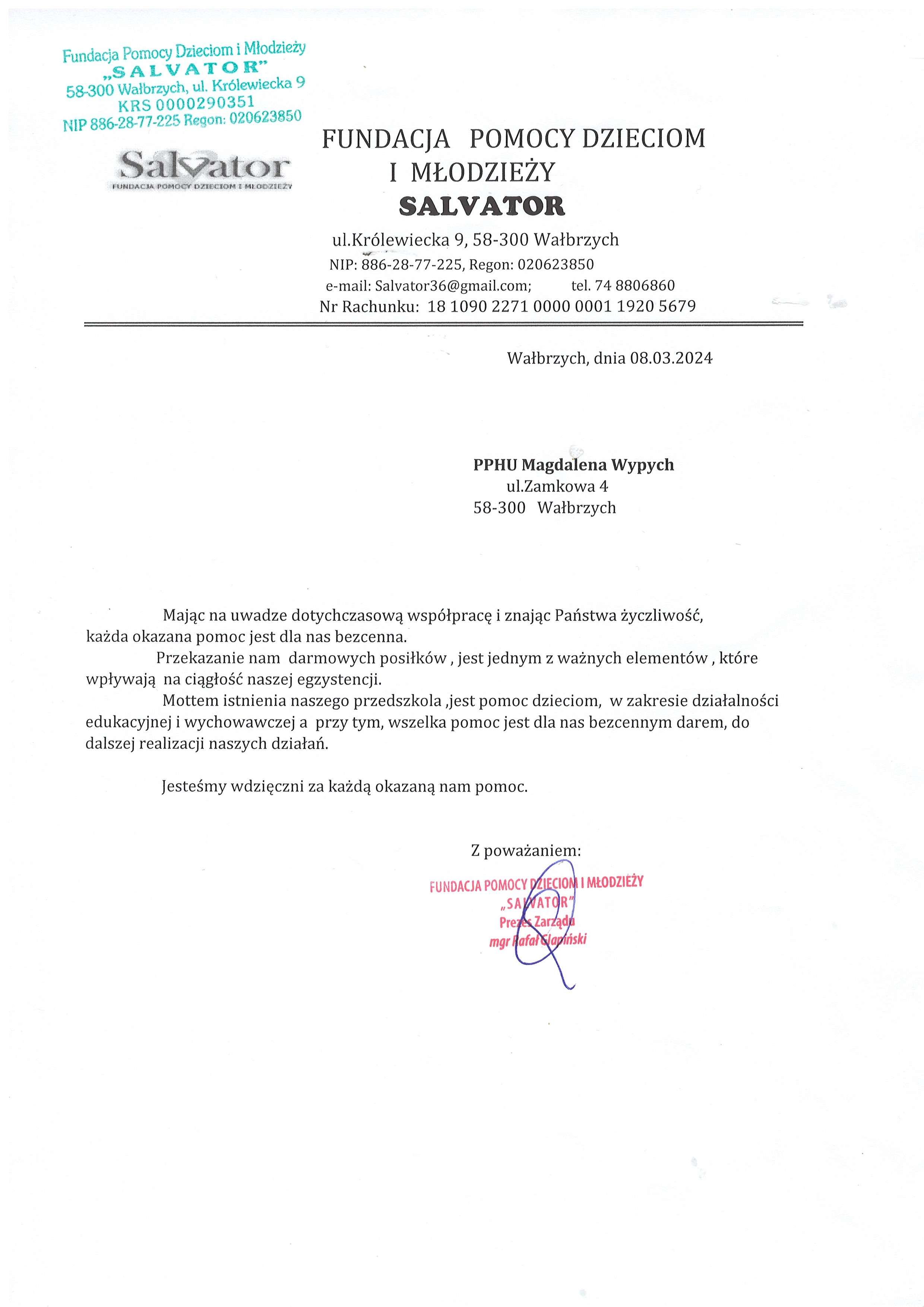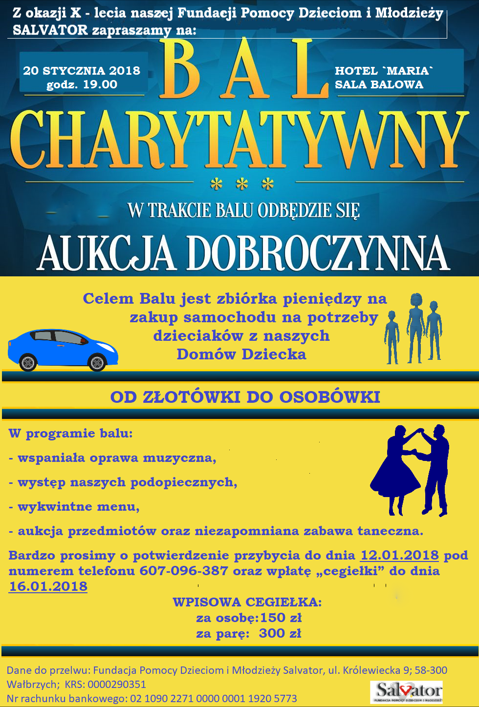 Dane do przelewu: Fundacja Pomocy Dzieciom i Młodzieży SALVATOR; Ul. Królewiecka 9; 58-300 Wałbrzych; KRS 0000290351 Numer rachunku bankowego 02 1090 2271 0000 0001 1920 5773 |